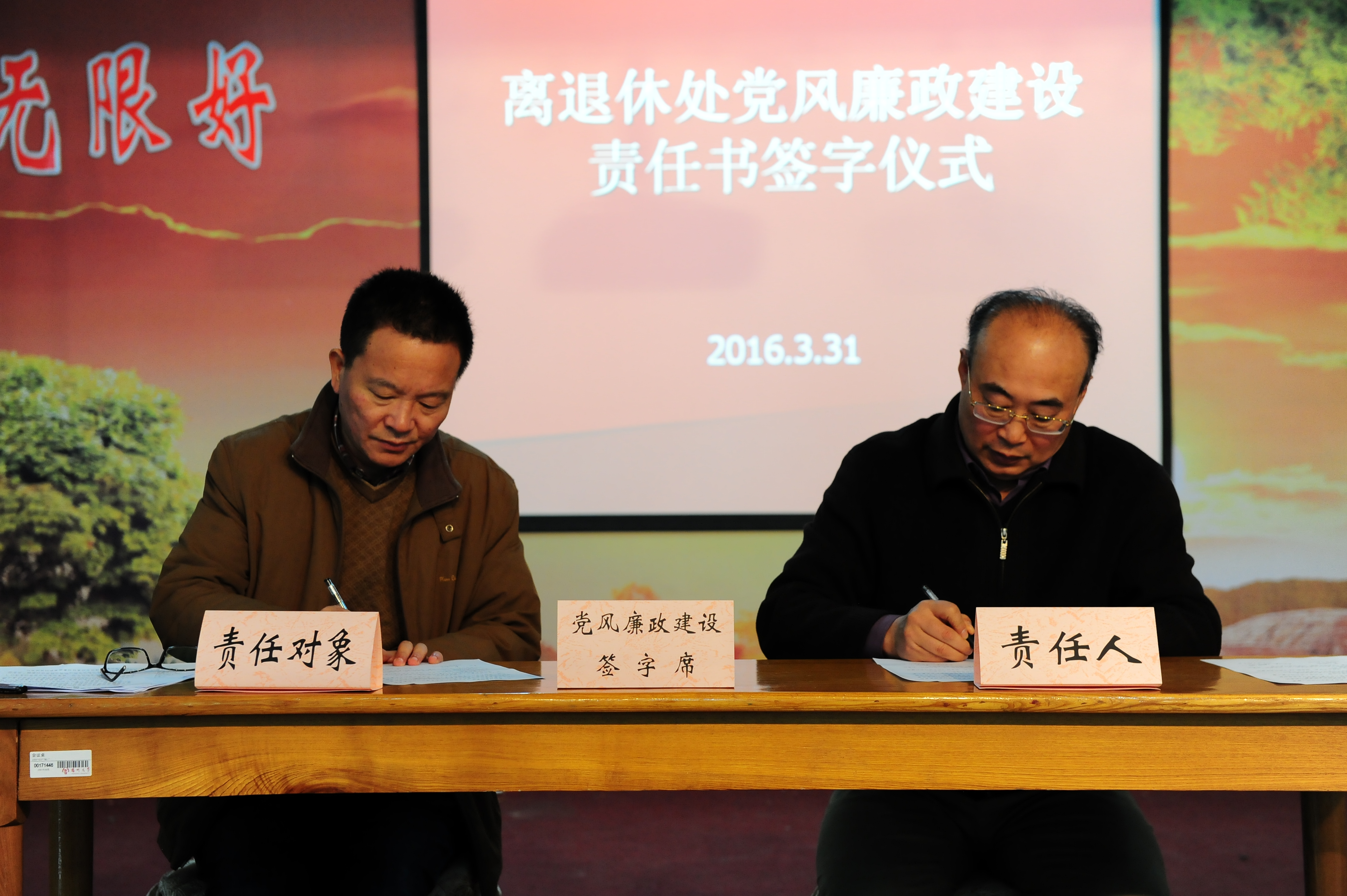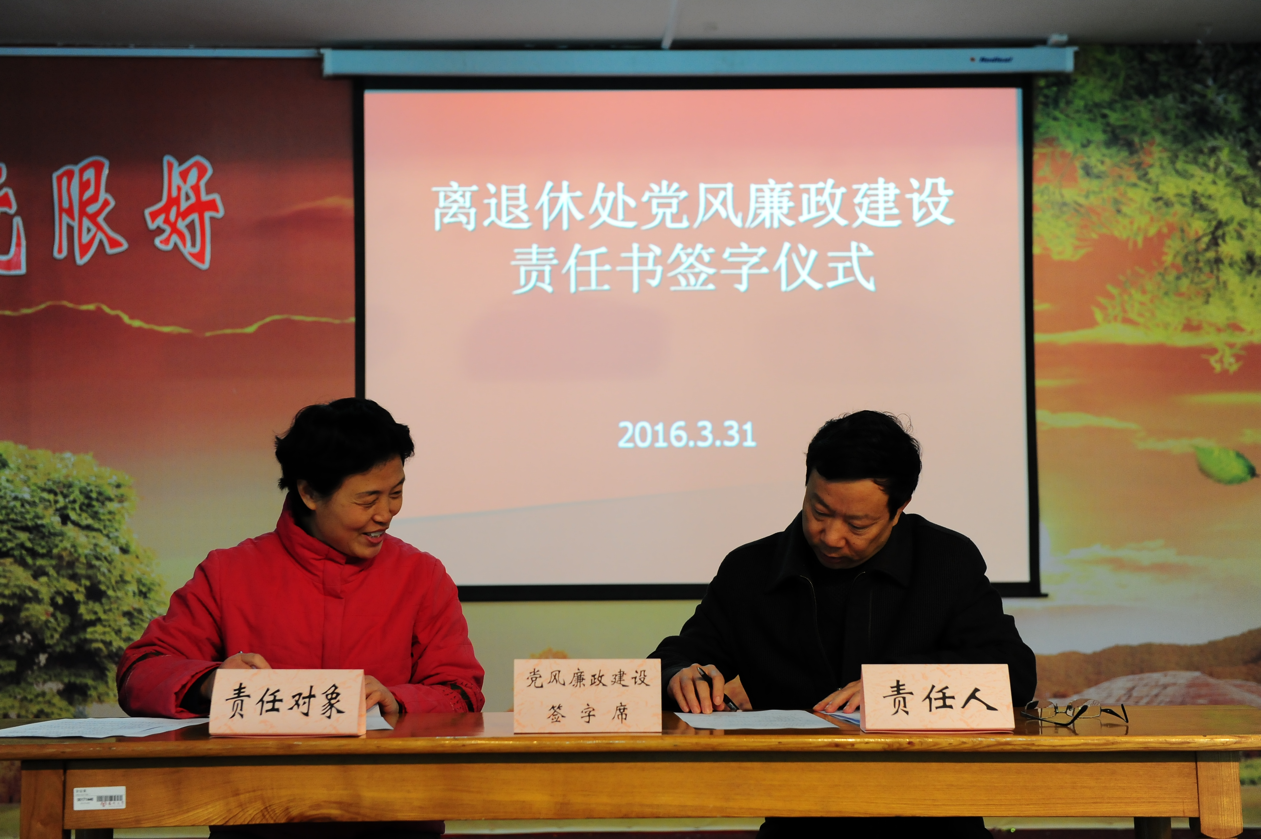 3月31日,在离退休处二楼多功能厅,离退休党工季举行了党风廉政建设责任书的签订仪式。