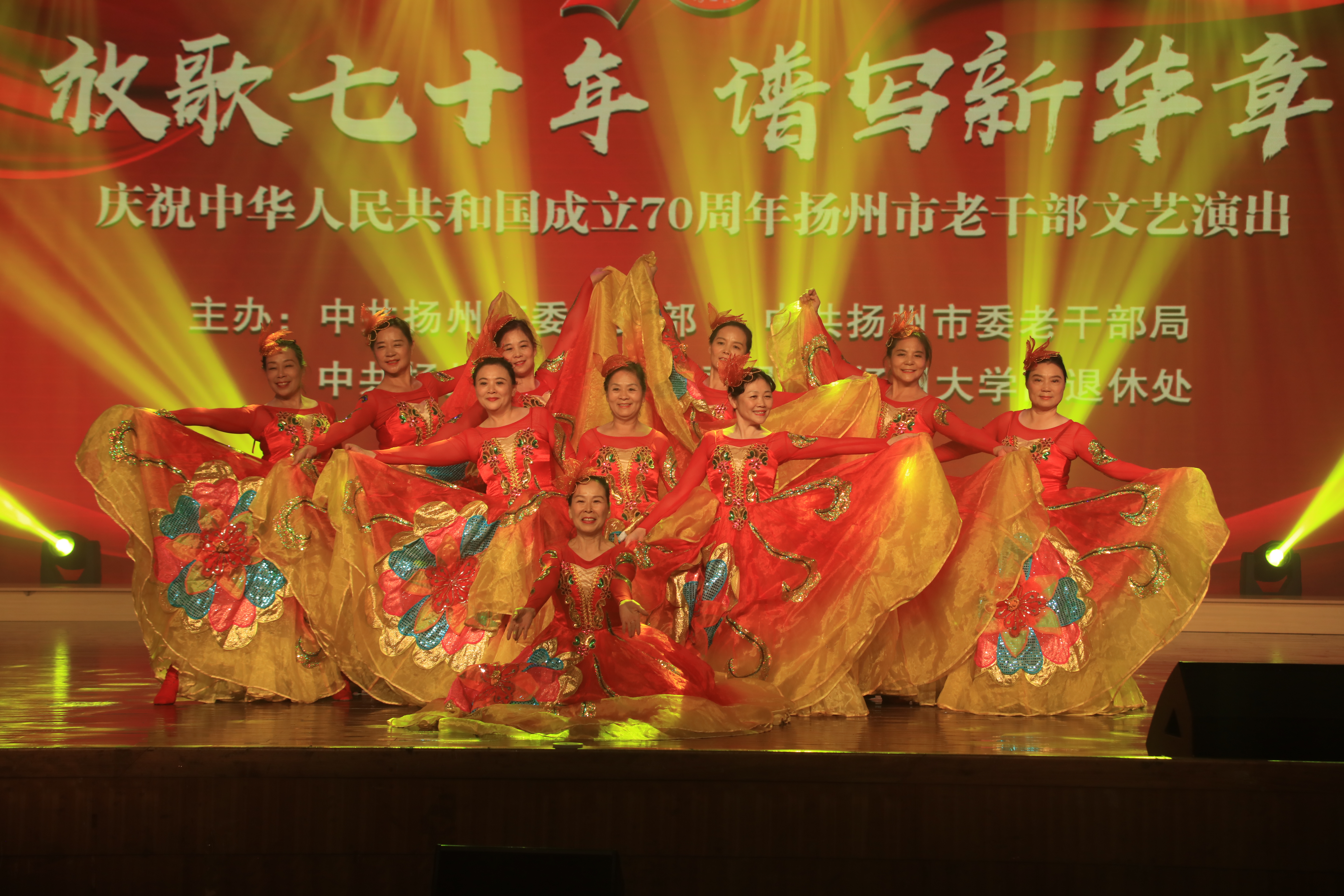 整场演出以“放歌七十年,谱写新华章”为主题,分为“与祖国共成长”、“与时代同奋进”、“与岁月竞芳华”三个篇章。晚会在歌舞《在希望的田野上》拉开序幕。来自我校与扬州市直及各县市区文艺团体、老干部社团的演职员们,用精心创作编排的节目,打造了一台别开生面的视觉盛宴,热情讴歌了新中国成立70年来走过的风雨历程,生动反映了改革开放40年来的伟大实践。由我校离退休党委、离退休处选送,老干部艺术团表演的歌舞《踏歌起舞》、配乐诗朗诵《老有老的骄傲》等节目,充分展示了广大离退休老同志退休不退志、退休不褪色的时代本色和爱国、爱党、爱生活的精神风貌,赢得全场观众阵阵热烈的掌声。离退休处党政十分重视此项工作,不仅选派了演员参加演出,还专门组织百余名离退休老同志观看演出。