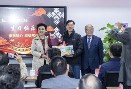 会议期间,现场对今天过生日的全校老同志发出了生日祝福短信,并给寿星代表邓兴明老师送上了鲜花和蛋糕,组织了老同志代表进行了现场操作体验。