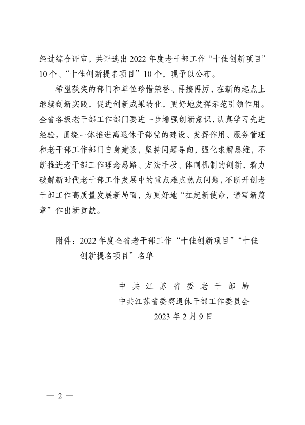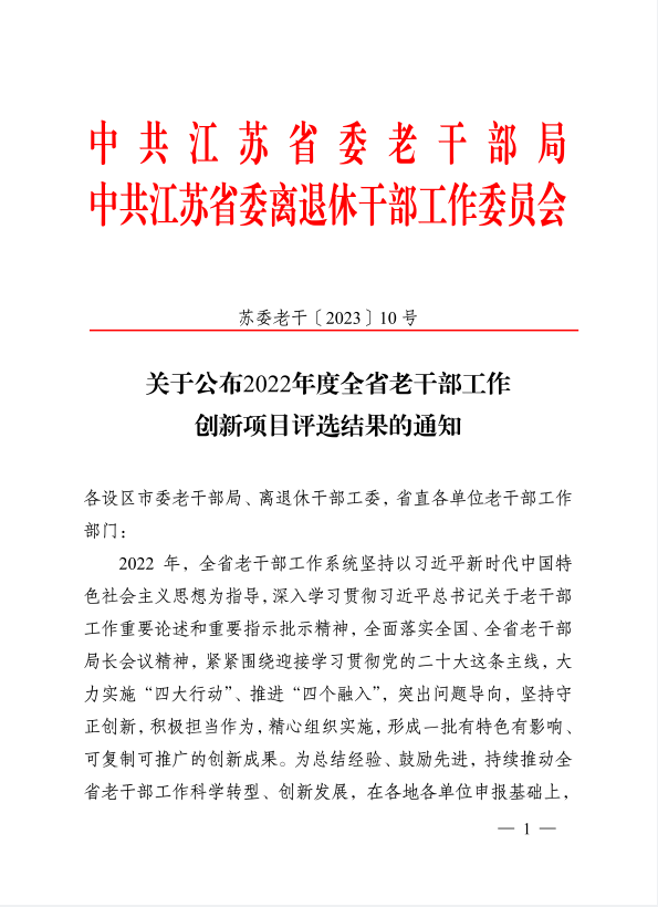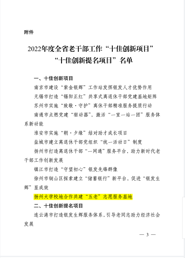 近日,中共江苏省委老干部局、省委离退休干部工委联合发文公布全省2022年度老干部工作创新项目评审结果,分别表彰“十佳创新项目”10个、“十佳创新提名项目”10个。我处组织实施的基层党建书记项目“校地合作共建扬州大学‘五老’志愿服务基地”获评“十佳创新项目”,这也是全省高校唯一获此殊荣的项目(其余9项中8项系地级市申报、1项系地级市所辖区申报)。