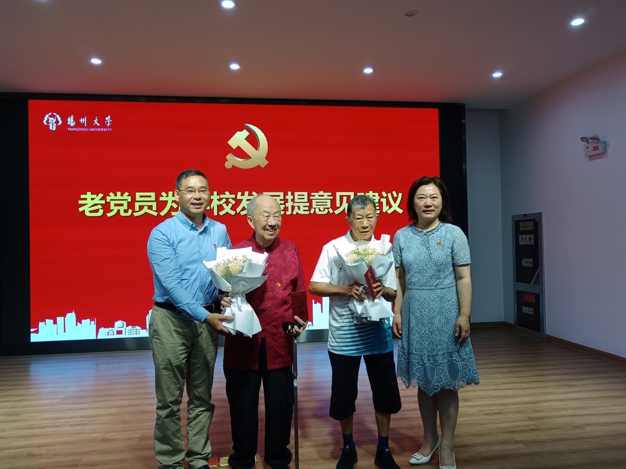 在活动举行过程中,离退休党工委副书记、副处长孙春祥和党工委委员、副处长夏玉荣给到场参会的今年90整寿的潘德昌、刘完灿两位老师颁发了生日慰问金与手捧花,并代表离退休党工委对他们表示祝贺。会后,所有参会的老党员代表都领取了校区离退休科特别安排的慰问品。