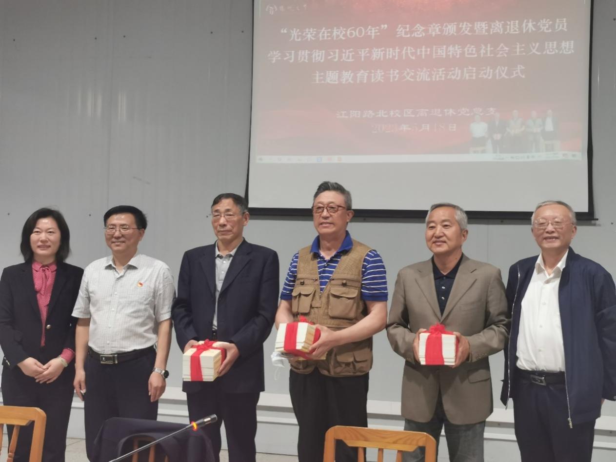 5月18日下午,江阳路北校区举行“光荣在校60年”纪念章颁发暨离退休党员学习贯彻习近平新时代中国特色社会主义思想主题教育读书交流活动启动仪式。校离退休党工委书记、离退休处处长生永明出席仪式并讲话,校离退休党工委委员、副处长夏玉荣全程参与,江阳路北校区离退休党总支书记周详主持仪式。
