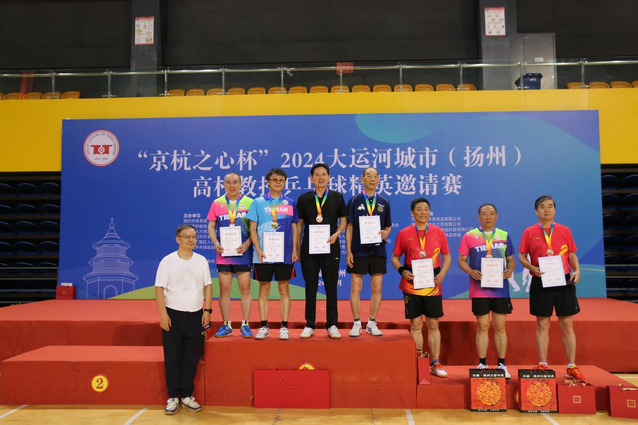2024年8月3日—5日,“京杭之心杯”2024大运河城市(扬州)高校教授乒乓球精英邀请赛在扬州隆重举行,来自北京大学、清华大学等100多所高校的170多位教授参加了这次比赛。我校退休教授、扬州市乒乓球协会副主席陈景春受邀参赛同时担任组委会副主任兼秘书长。活动期间,陈景春教授主持赛事组委会会议及欢迎推介会,并取得男子单打(丙组)季军的好成绩。我校退休教授颜彪、马宏柏等应邀参赛。离退休处处长、离退休党工委书记生永明、副处长夏玉荣在活动期间亲临比赛现场观摩赛事并为我校退休老同志选手加油鼓劲。