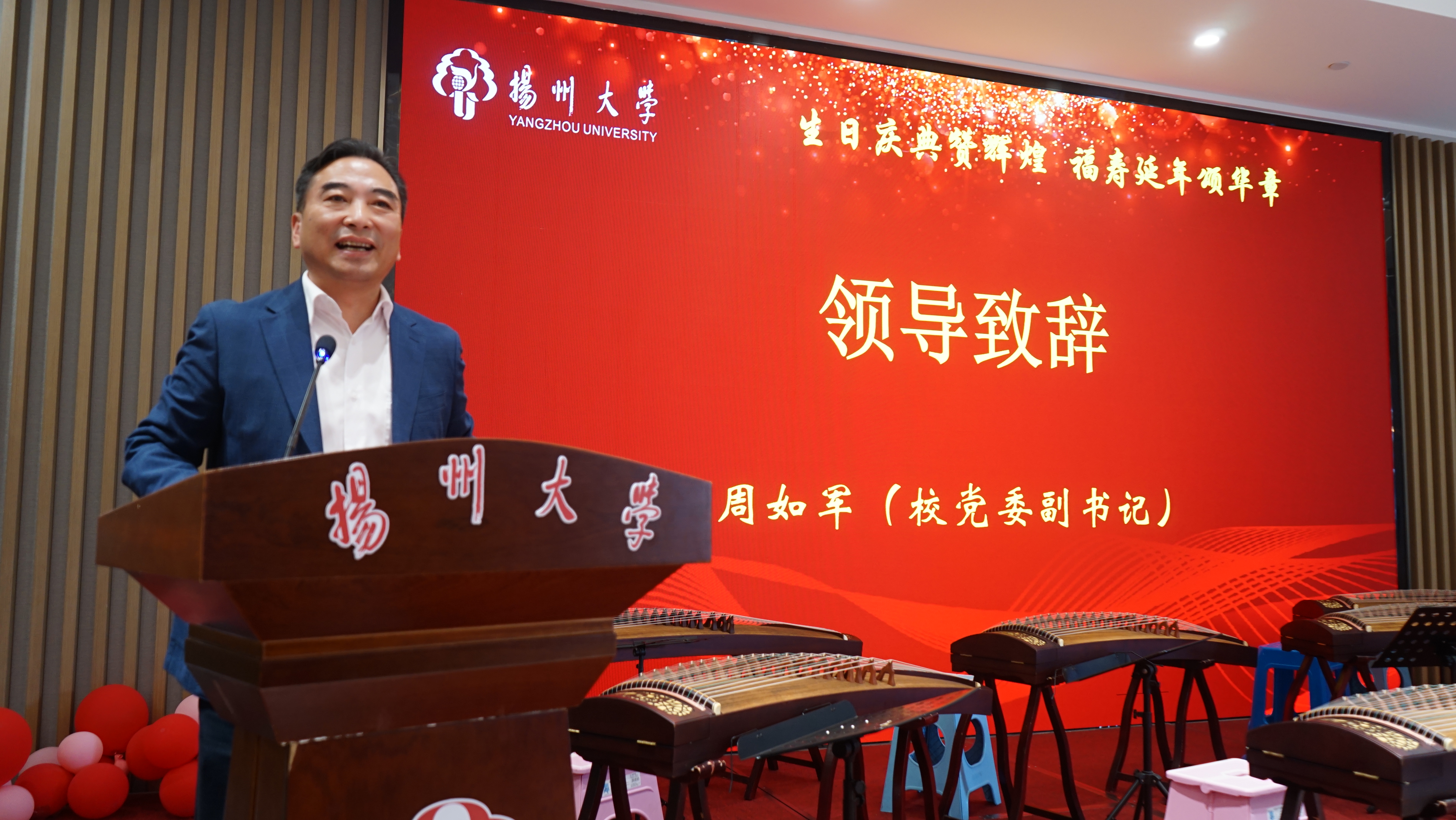 周如军在致辞时,首先代表学校党政和全校师生员工向老同志寿星们送上诚挚的祝福!向广大离退休老同志致以节日的问候和崇高的敬意!他指出,广大老同志对党的事业无比忠诚,对学校怀有深厚感情,为学校的建设和发展作出了巨大贡献,是学校事业发展的宝贵财富。他表示学校将一如既往地重视和支持老干部及离退休工作,全面贯彻党的二十届三中全会和习近平总书记关于老年事业发展、新时代老干部及关心下一代工作的重要指示精神,用心用情、精准服务,努力为广大离退休老同志创造更加适宜、更加丰富的健康与文化养老条件,不断提升老同志们的获得感、幸福感和归属感,真正实现大家对老年美好生活的向往和期待。他希望各位老寿星老同志们始终保持老骥伏枥、老当益壮的健康心态和进取精神,在颐养天年之余,继续发挥优势作用,为赓续红色血脉、讲好扬大故事凝聚正能量,为服务立德树人根本任务、助力学校奋力谱写高水平研究型大学建设现代化新篇章作出新的贡献。