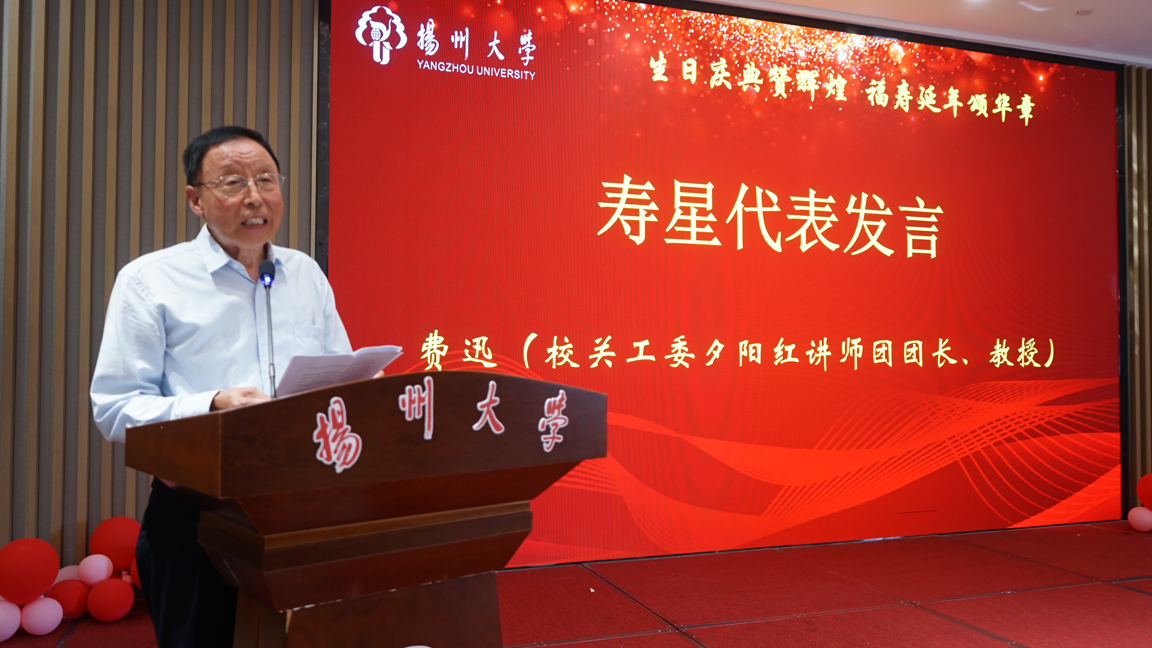 寿星代表费迅教授发表生日感言,忆往昔,谈今朝,感恩今日美好生活,感谢组织组织关怀,让老同志倍感温暖。他还发出倡议,希望广大老同志始终保持阳光心态,乐享幸福美好生活,做到“退休不退志”、“离岗不离党”,为学校事业发展力所能及发挥作用,得到老同志们积极响应。