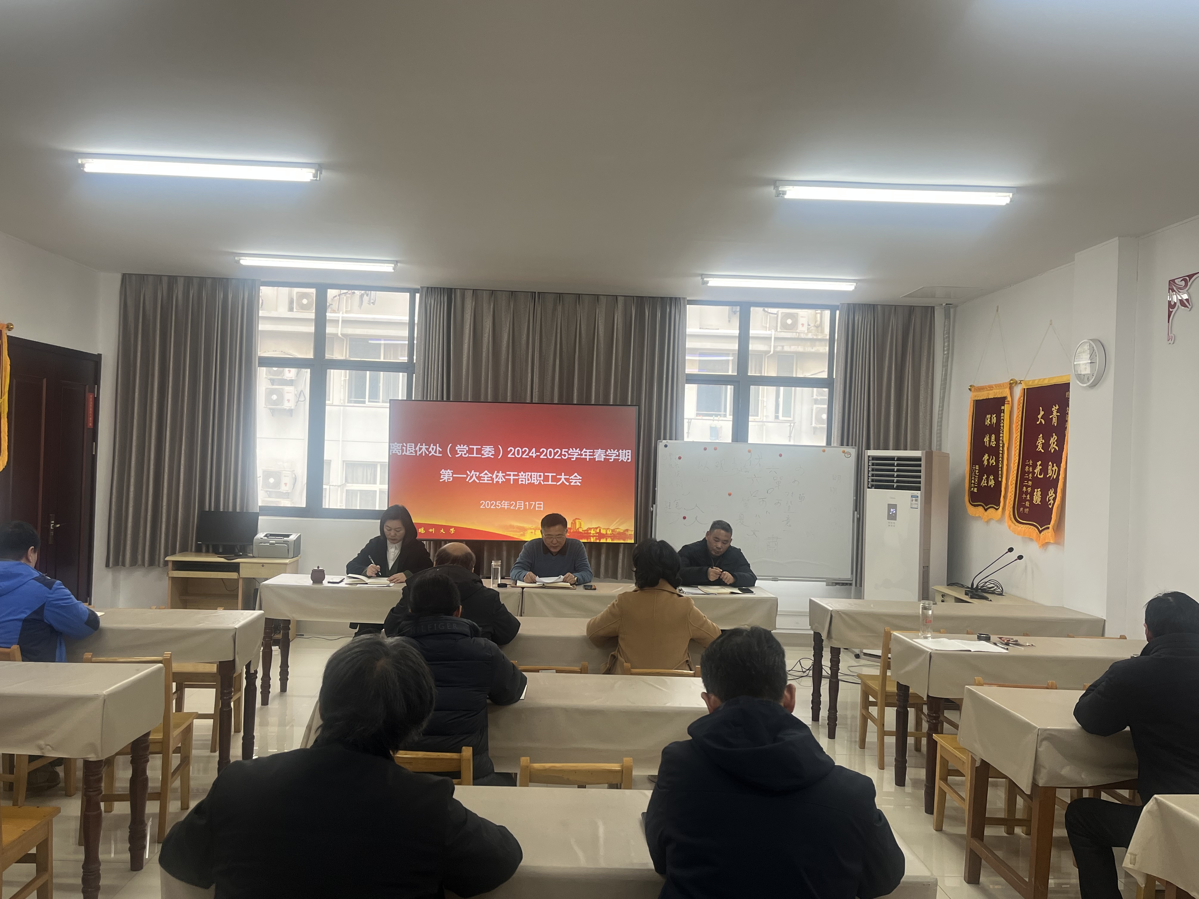 2月17日下午,离退休处召开新学期全处干部职工大会,传达学习校党委四届四次全委(扩大)会议和新学期全校干部教师大会精神,通报处领导班子2024年度专题民主生活会情况,总结部门上年度工作,部署2025年度部门党政工作及开学初主要工作。离退休处处长、党工委书记生永明主持会议,并就贯彻落实好学校系列会议精神、高质量推进2025年度部门党政重点工作以“凝心聚力谋发展 实干担当创佳绩”为题作主题发言。