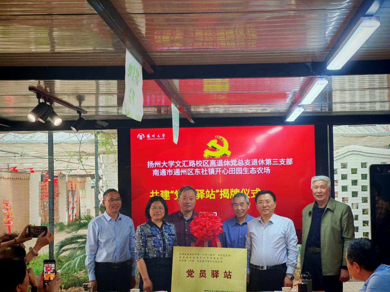 4月9日,我校文汇路校区离退休党总支退休第三党支部赴南通市通州区东社镇开心田园生态农场开展党建活动,举行了“牢记使命担当,建设美丽乡村”主题党日活动暨共建“党员驿站”揭牌仪式。扬州大学离退休处(党工委)生永明处长(书记)与孙春祥副处长(副书记)出席了本次活动,开心田园生态农场总经理孙春梅校友与文汇路校区离退休党总支书记沈渭滨、退休第三党支部书记陈鹏等共同为“党员驿站”揭牌。