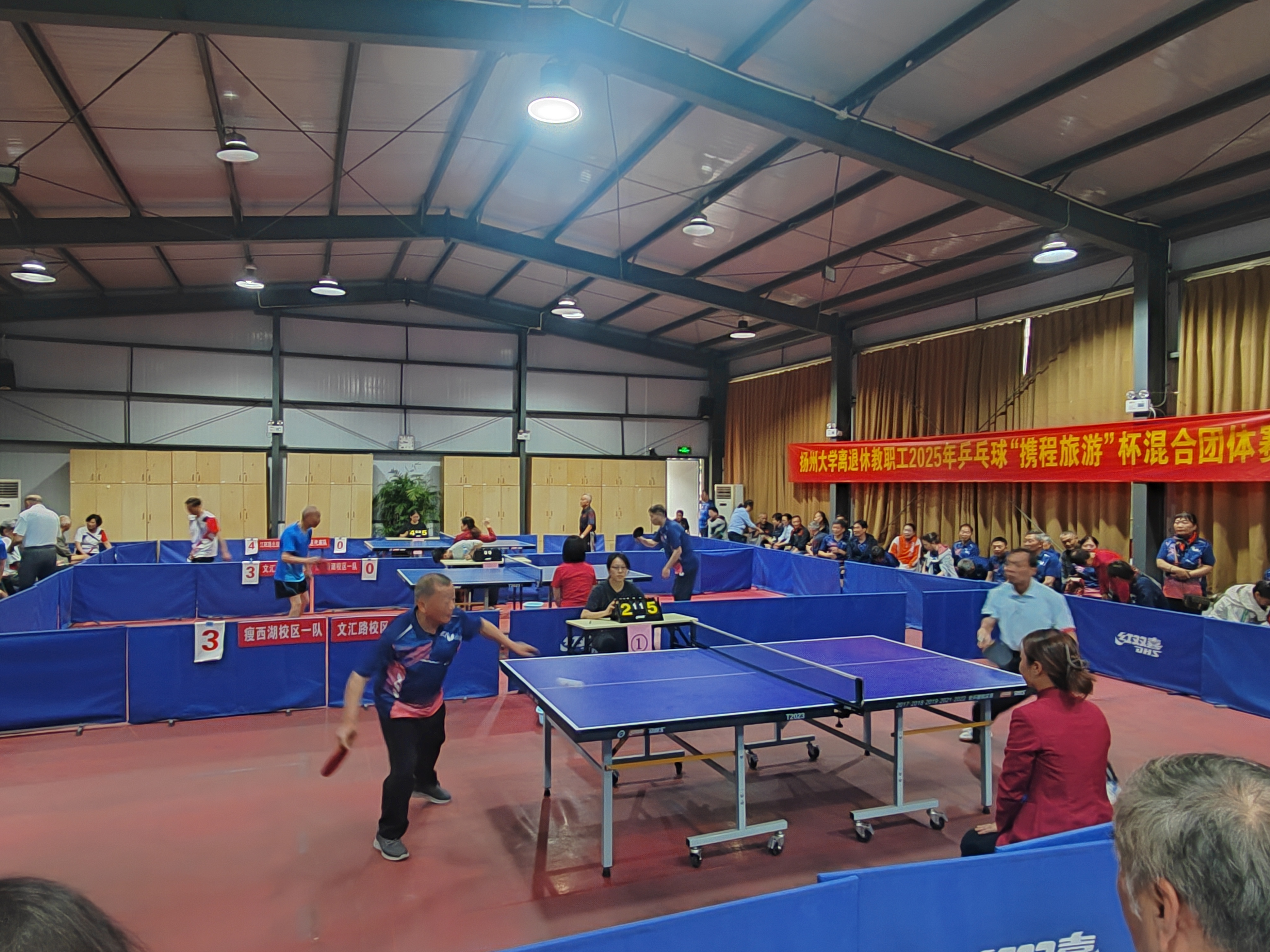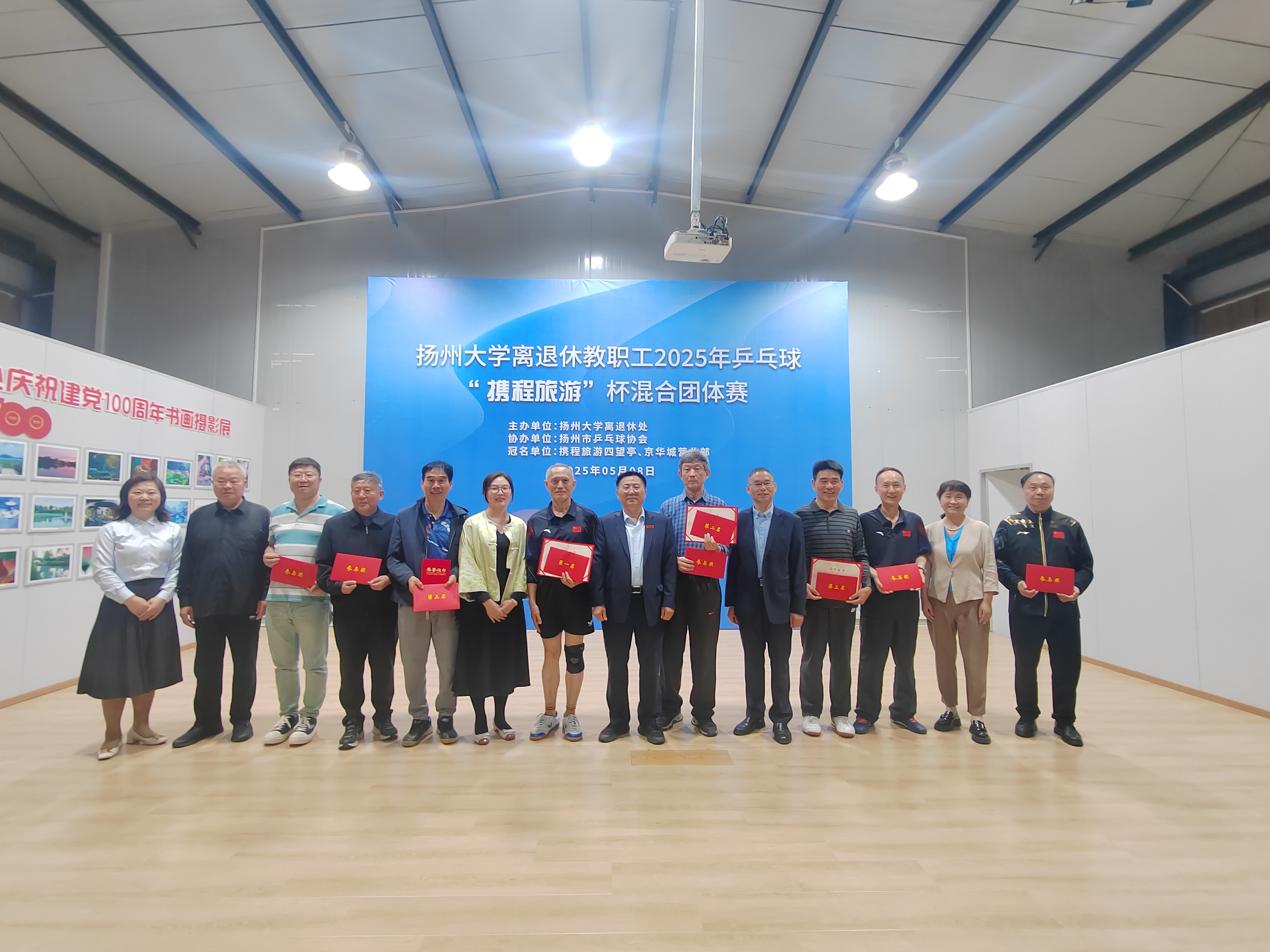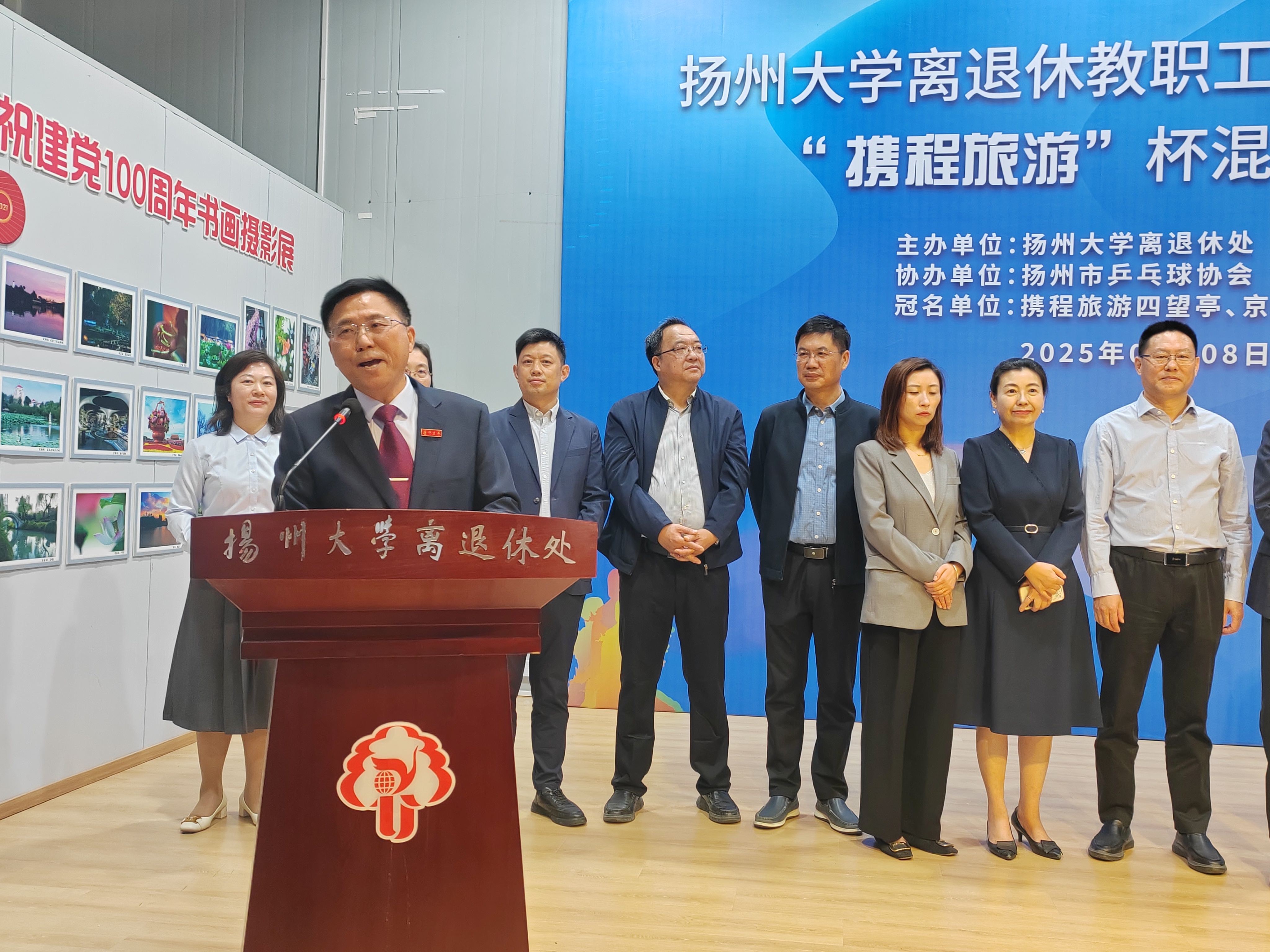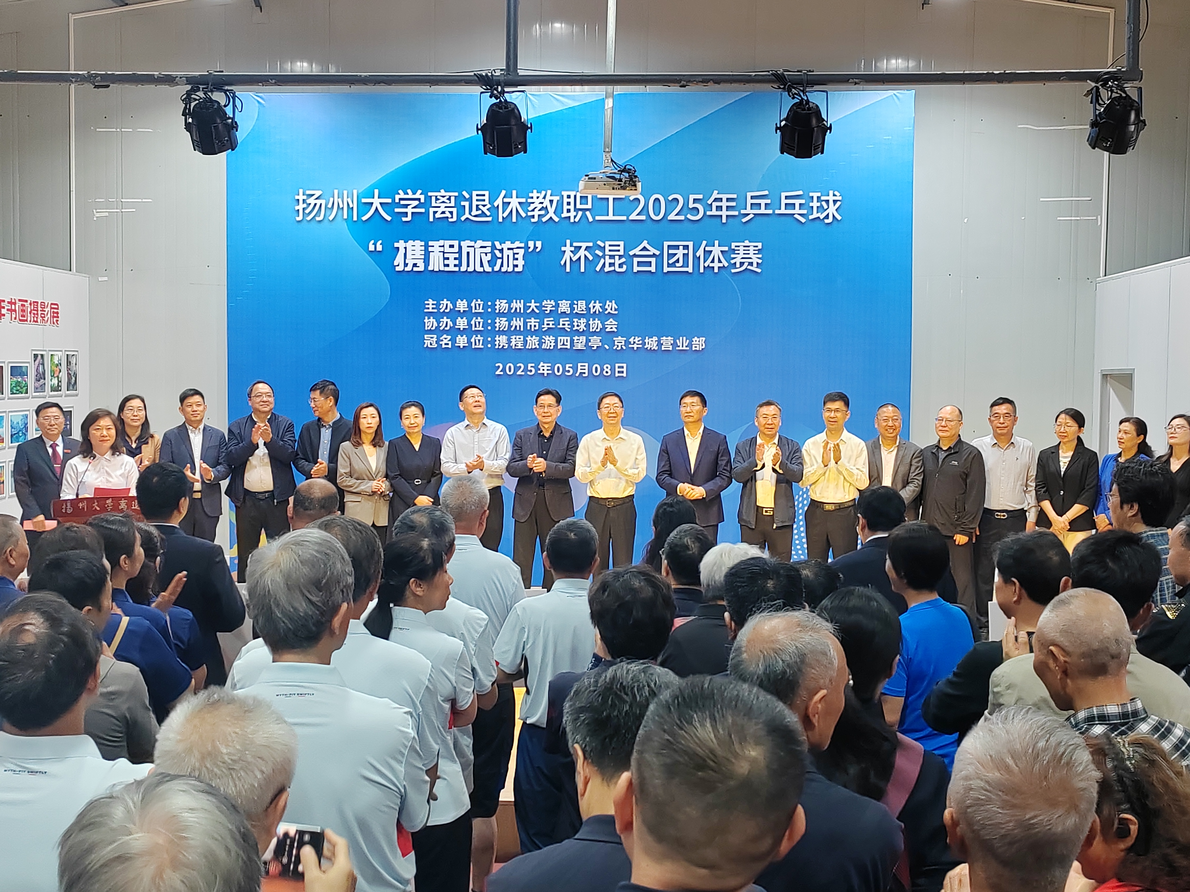 为进一步丰富文化供给,赓续校园文脉,传承校园文明,繁荣校园文化,同时充分展示我校离退休教职工充满活力、积极向上的良好精神风貌,5月8日,由校离退休处主办,扬州市乒乓球协会协办,携程旅游四望亭、京华城营业部冠名赞助的扬州大学离退休教职工2025年“携程旅游”杯乒乓球混合团体赛在江阳路北校区离退休教职工活动中心举行。校党委常委、副校长蒋乃华,校党委常委、宣传部部长张信华出席比赛开幕式。学校各有关职能部门负责人出席开幕式,共同为离退休老同志文体赛事加油喝彩。