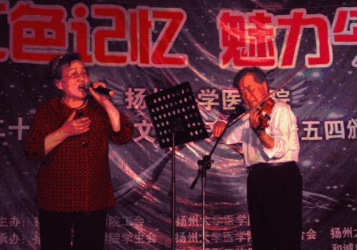 五月六日晚,扬大医学院礼堂里华灯齐放,正在举行医学院“五·四” 颁奖晚会,晚会主题是“红色记忆. 魅力今朝”。淮海路校区离休干部李兵老师作为特邀嘉宾参加演出。当李兵老师和她的老伴手拿小提琴,精神矍铄站在舞台上时,场下的师生都为这对八旬老人报以热烈的掌声。随着李兵老师对党的一段深情道白和一首《党啊,我亲爱的妈妈》的演唱,更是博得了场下师生的八次热烈掌声。许多观众都被李兵老师的精湛唱技和克服年高腿脚不好而参加演出的精神而深深感动。