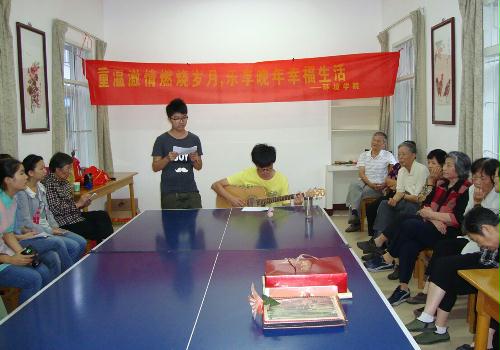 9月29日,江阳路南校区活动室,离退休老同志与环工学院爱老会的同学们开展了主题为“重温激情燃烧岁月乐享晚年幸福生活”共建活动。同学们和老同志热情互动,各展才艺,老少共乐,呈现了温馨、和谐的动人画面。