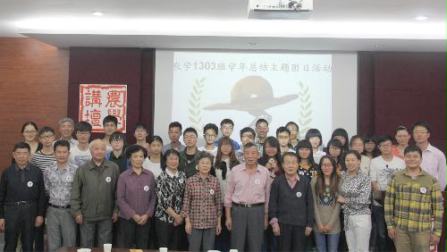 丁立同学代表班级,向离退休老同志们汇报了同学们上一学年学习、组织发展、任职、获奖、助学金、班级活动、扣分、宣传报道等方面的情况。特别是在2014年暑期社会实践中获得优秀成绩,被徐州日报、中国江苏网等媒体报道。离退休老同志语重心长地说:“农学1303班的同学们的成长、成人、成材和一年来取得的成绩让大家感到欣慰,这些成绩比菊花茶和重阳糕更加可口香甜”。勉励同学们锻炼好身体、孝敬长辈,健康成长,报效国家。