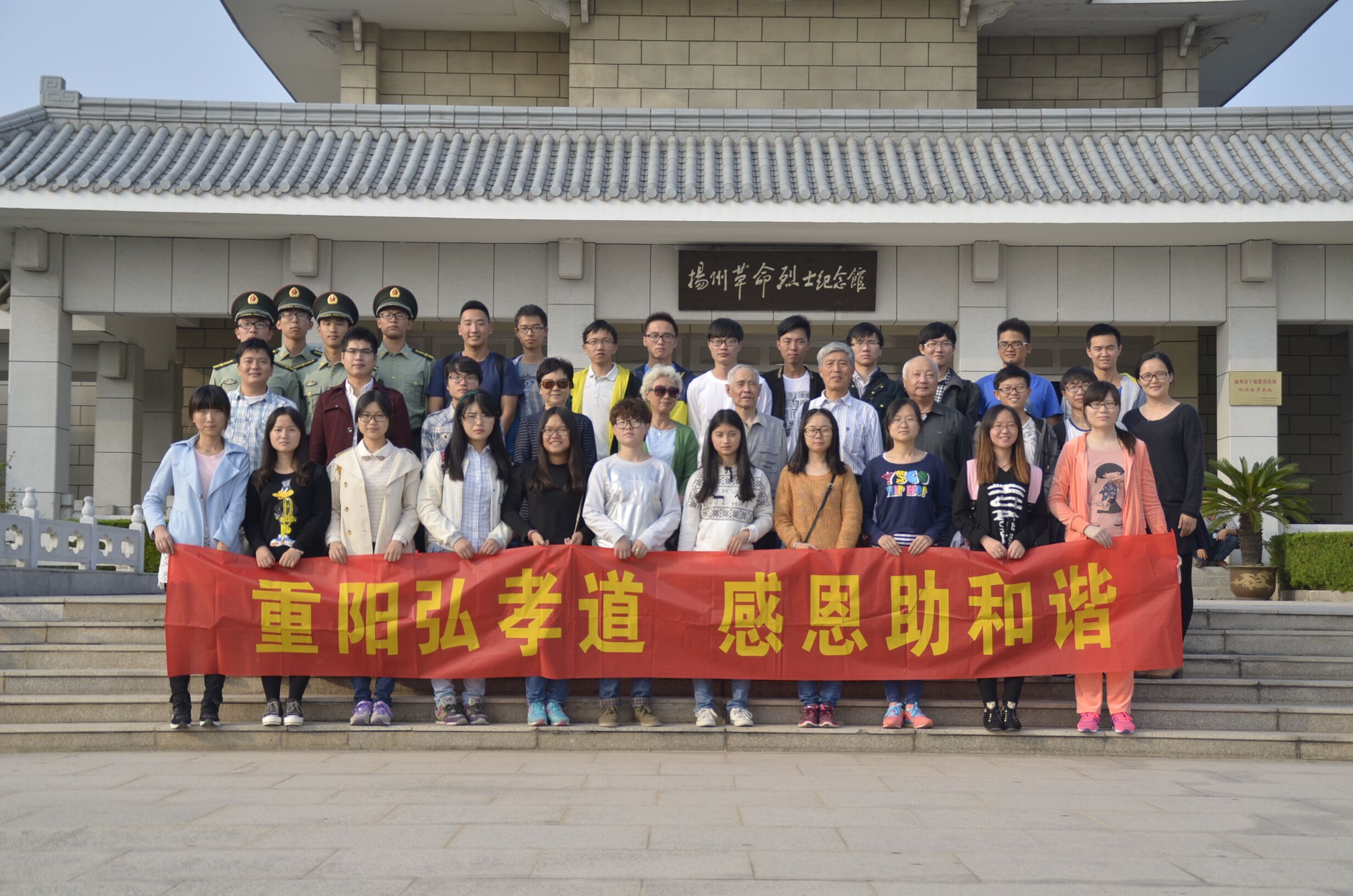 一年最好,偏是重阳。当天下午,文汇路校区退休一支部程桂鑫书记、马富民老师、还特别邀请了校区离休党支部孙复汉书记等五位老教师与共建班级的同学们一同赴扬州烈士陵园。校国旗班为烈士献上挽联,在纪念碑前大家默哀;程老书记说:“我们要牢记这段历史,特别是你们年轻人,要知道现在生活的来之不易,要学会感恩……。”、“与老教师们一起到户外来走走,并借此表达对烈士的怀念之情,更好的激励学生践行社会主义核心价值观,铭记当代青年的使命。”院团委副书记蒋越星说道。农学1303班丁立同学声情并茂的说:“正值重阳佳节,我们饮水思源,不忘革命先烈走过的艰难岁月;我们老少同心,倾听老一辈们诉说那段值得永远铭记的历史遗闻……。” “我们班从大一进校开始就与退休一支部共建。从生活到学习,爷爷奶奶们都尽力给我们支持和帮助,我们希望能借着这次节日报答爷爷奶奶的爱。”郑彤同学如此表达心声。