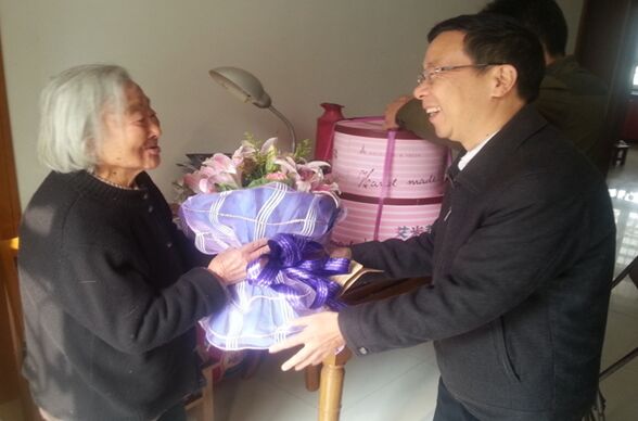 一走进苏农一村期颐之年的吴蕴芳家中,卫处长就亲切地拉着老人家的手拉起了家常,并详细询问了老人的生活起居、身体状况,吴蕴芳老人思维清晰,身体硬朗,生活很有规律,老人愉快地接受了生日寿桃、鲜花和慰问金,老人满脸微笑,感谢党、感谢学校对离退休老同志们的关心、照顾!