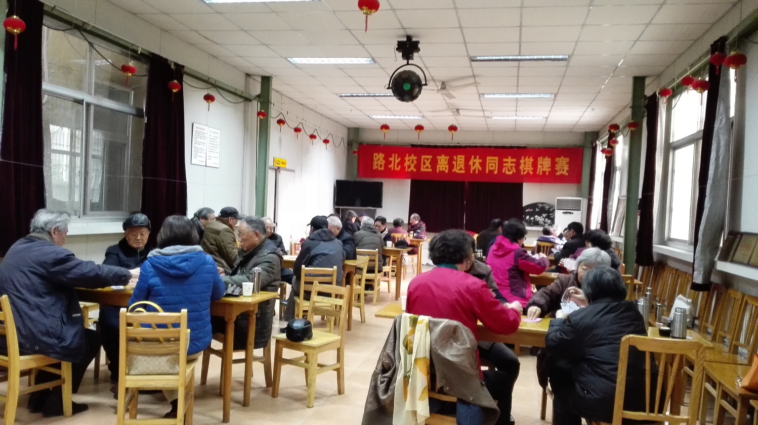 12月23日下午,江阳路北校区离退办举办了迎新年扑克牌、麻将比赛,有48位退休同志参加了比赛。老同志们以牌会友,比赛现场充满和谐欢乐的气氛。