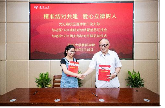 6月15日上午,在兽医学院二楼学术报告厅,文汇路校区退体第三党支部与兽医学院结队共建班级(动医1404和动检1701班)举行团支部结对共建交接仪式暨感恩汇报会。
