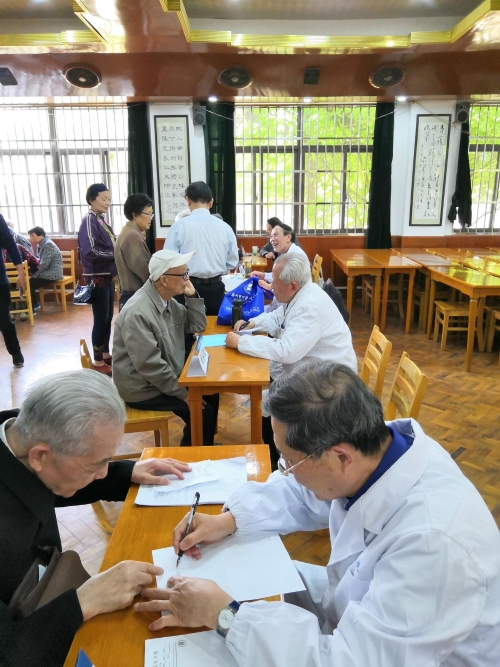 活动现场人声鼎沸、前来问诊者络绎不绝,离退休老同志们带着自己的体检报告、就医手册前来咨询,专家们耐心解答各种各样的健康问题,专家们还为前来咨询的老人把脉、听诊、认真查、耐心听他们讲述自己的病症,为一些需要服药的老人开处方,还为一些长期服药的老人调整了治疗方案,并指导他们调整不良的生活习惯。两位学生则为前来咨询的老同志测量血压。老人们在家门口享受了一对一服务的针对性健康服务,个个带着放心的笑容离开。