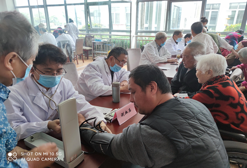 5月14日上午医疗专家团一行人来到连云区社会福利院,为这里的老人看病问诊。这个福利院大多数都是失能或半失能老人,刚进福利院就看见大厅里面一排排全是坐在轮椅上的老人,旁边站着推轮椅的护理人员,满满坐了有上百人。在福利院工作人员的精心组织下,老人们排队依次详细地向专家描述自身症状,针对自身遇到的健康问题,寻求专家组的建议。专家们发挥各自所长,为老人们把脉听诊、仔细询问病史、开具处方,并对老人们遇到的健康问题给出建议,对一些错误的保健观念予以指正。老专家上门义诊志愿服务活动得到了福利院老人与工作人员的积极响应,大家十分珍惜向知名老专家问诊的机会,对专家团一行充满了感激之情。