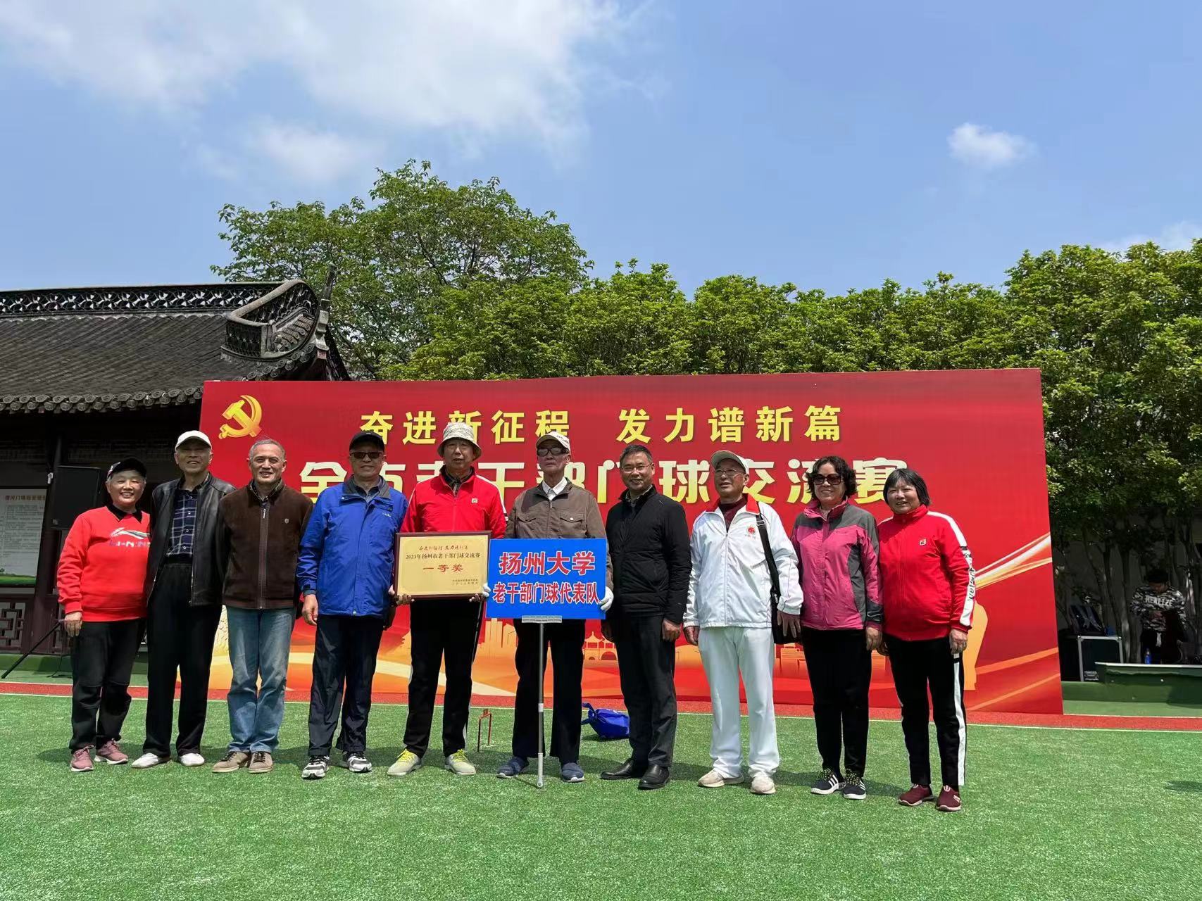 2023年4月26日,由扬州市委老干部局主办,扬州市老干部活动中心承办的“奋进新征程,发力谱新篇—全市老干部门球交流赛”在扬州漕河门球场举办。扬州大学代表队一行11人参加了比赛。经过激烈角逐,扬大老干部代表队获得冠军。