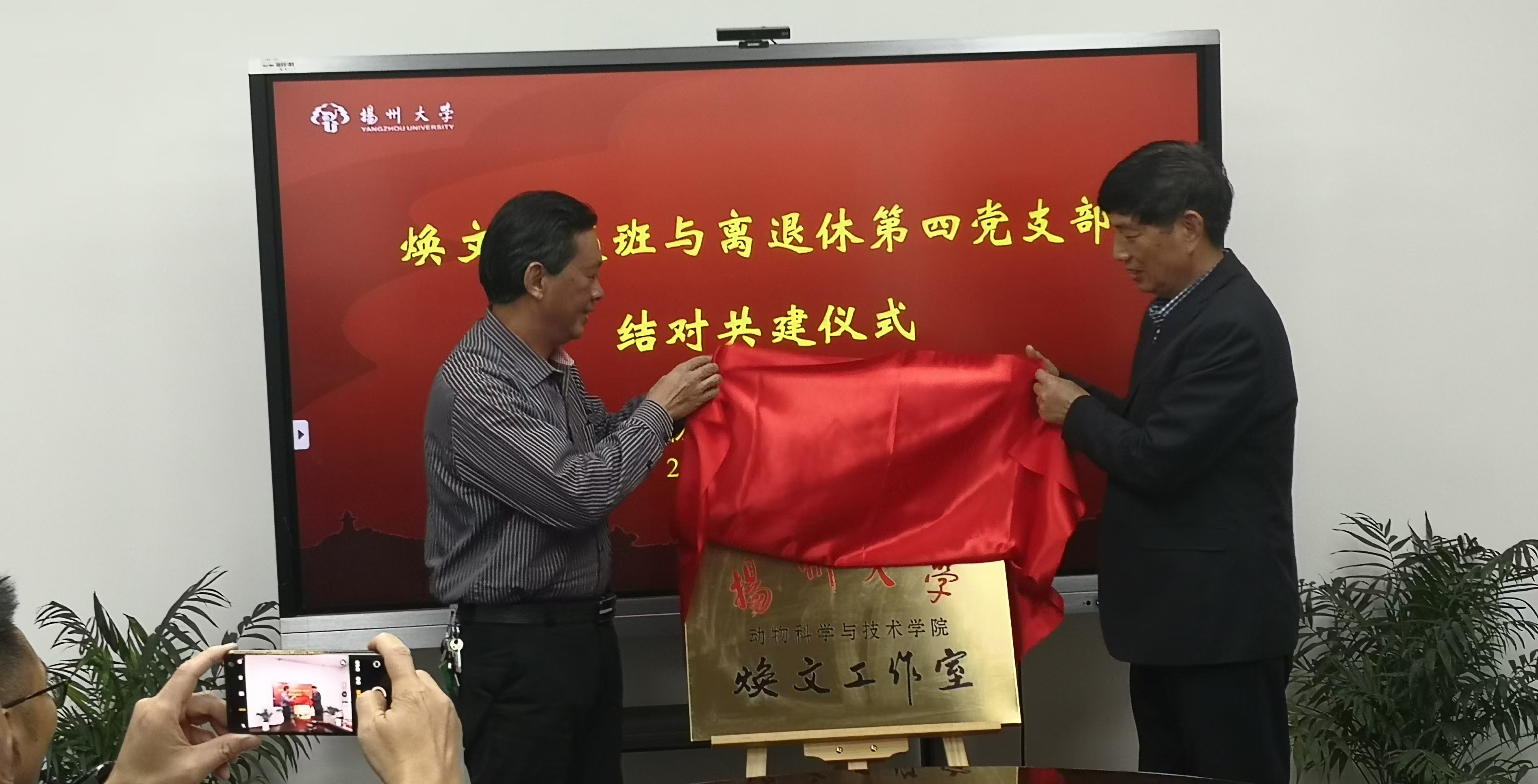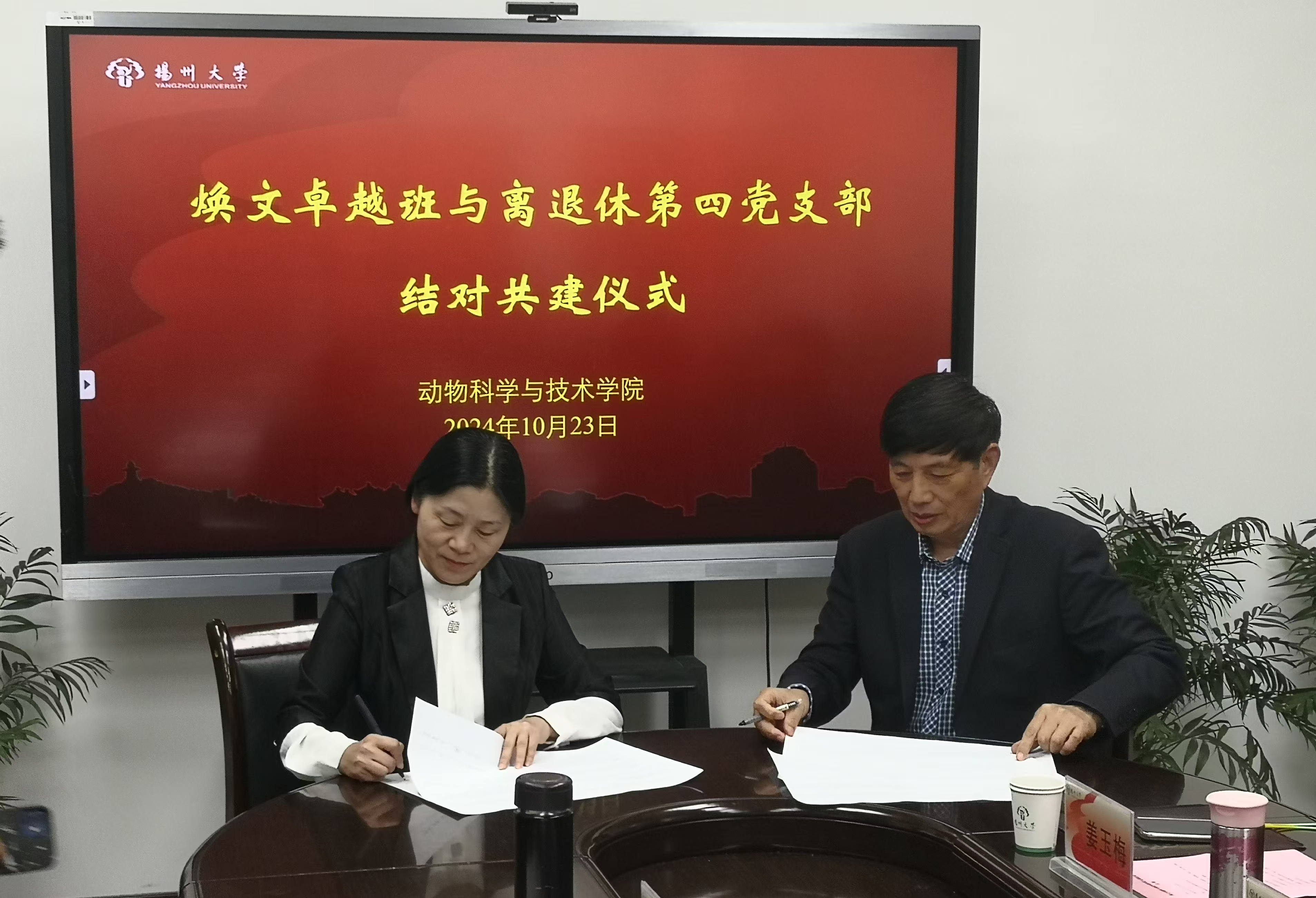 10月23日下午,文汇路校区退休第四党支部与“焕文卓越班”结对共建签约仪式在扬州大学动物科学与技术学院举行。