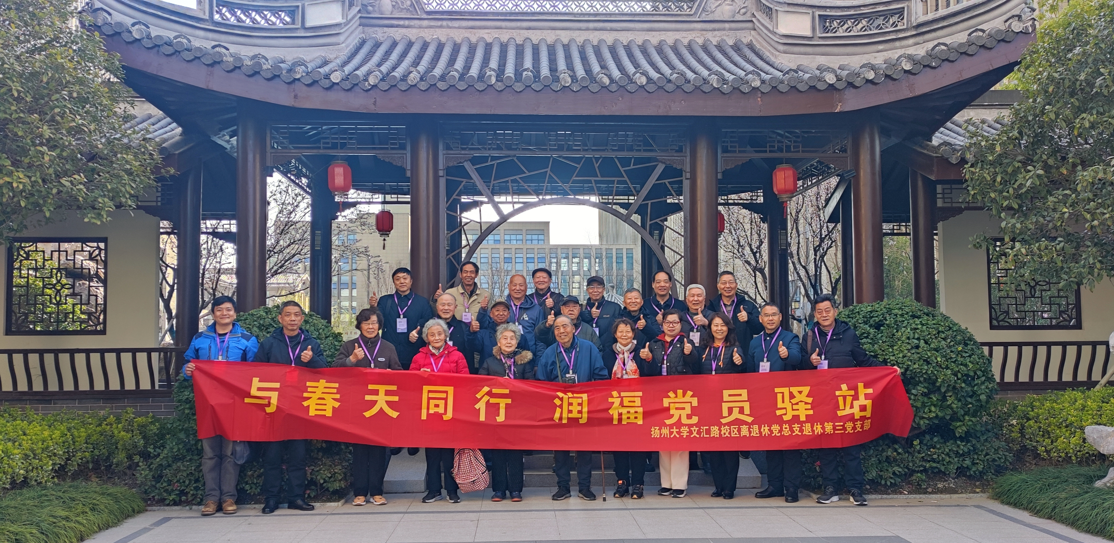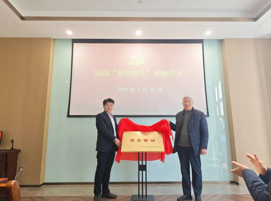 3月20日,扬州大学文汇路校区离退休党总支退休第三党支部在玖龙湖医养健康城与江苏润福实业有限公司举行了“与春天同行,共建党员驿站”活动。扬州大学离退休处(党工委)孙春祥副处长(副书记)出席本次活动,江苏润福实业有限公司孙忠裕总经理与文汇路校区退休第三党支部陈鹏书记和共同为“党员驿站”揭牌。