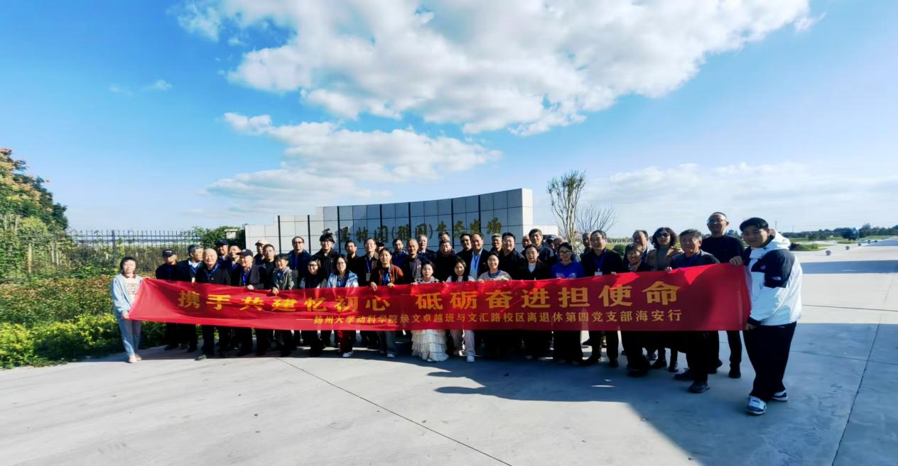 10月22日,秋高气爽,风和日丽。扬州大学文汇路校区退休第四党支部党员与动物科学与技术学院焕文卓越班师生一行近50人赴海安联合开展共建党日活动。循着红色足迹、探访产业一线,在行走的课堂中传承红色基因、锤炼实践本领。