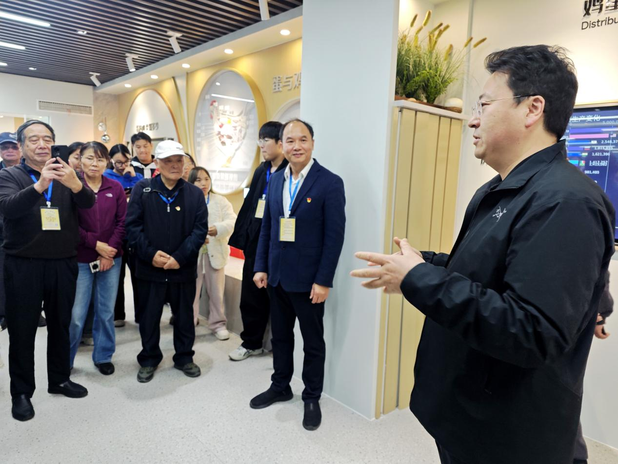 随后,一行人前往江苏天成雅周蛋业有限公司参观学习。该公司是华东地区单体规模最大的蛋鸡养殖基地,常年存栏300万羽商品蛋鸡,每年向市场提供3万多吨品牌鸡蛋,技术实力雄厚。在企业负责人的带领下,大家深入养殖车间和技术研发中心,详细了解企业的养殖品种、技术流程、生态模式以及产业发展规划。学生们围绕养殖技术难点、产业市场前景等问题积极提问,企业技术人员和离退休老党员结合专业知识与实践经验逐一解答,现场交流氛围热烈。此次企业参观让学生们将课堂理论与生产实践紧密结合,拓宽了专业视野,也让老党员们看到青年学子对专业知识的渴求与钻研精神,实现了教学相长、薪火相传。
