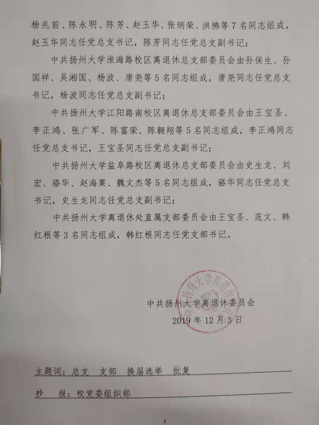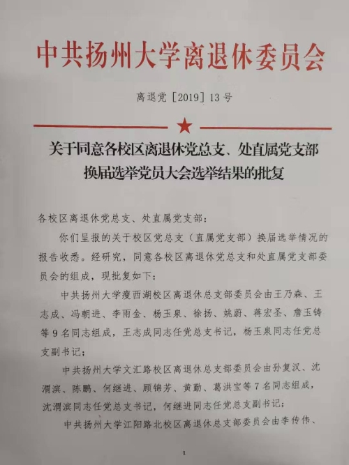 离退党[2019]13号关于同意各校区离退休党总支、处直属党支部换届选举党员大会选举结果的批复