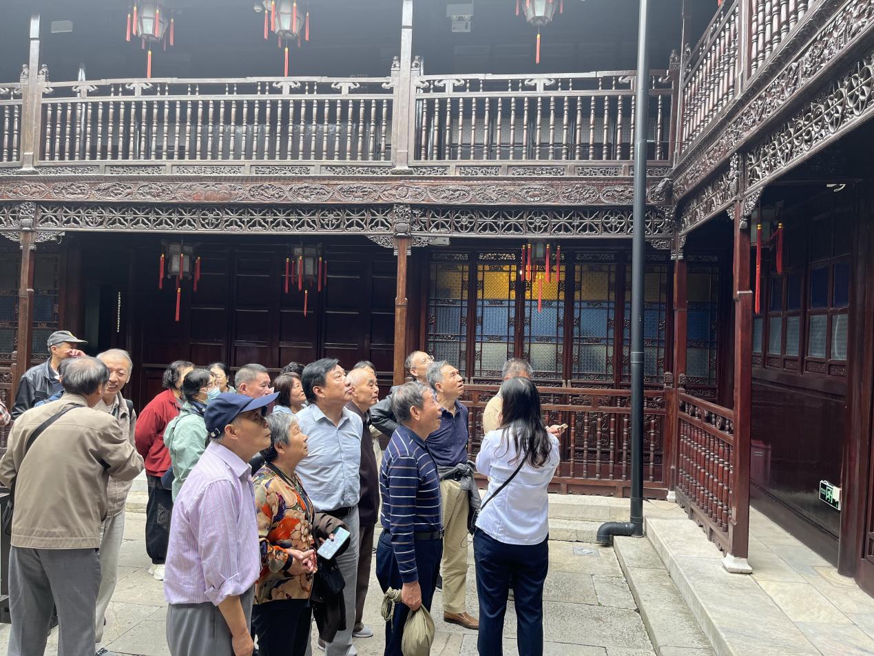 金秋十月,丹桂飘香。老同志们早晨从扬州乘车出发,来到本次考察的第一站——泰州口岸雕花楼。雕花楼原为清代私家园林,由江南木商在口岸始建,民国初年本地儒商进行了续建并扩建楼外园林。2002年,口岸雕花楼被省政府公布为省级文物保护单位。园内雅致玲珑,曲水流觞。老同志们流连于园中亭台楼阁之间,感受其中众多木雕、石雕艺术品的精美。